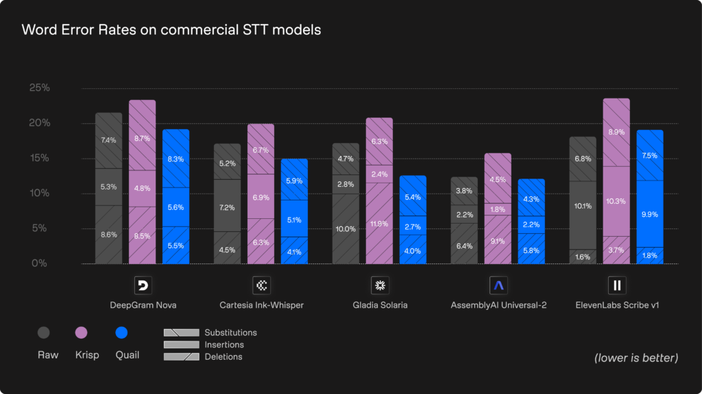 Take a look at Quail versus Krisp with five major STT providers: Deepgram, Cartesia, Gladia, AssemblyAI and ElevenLabs.