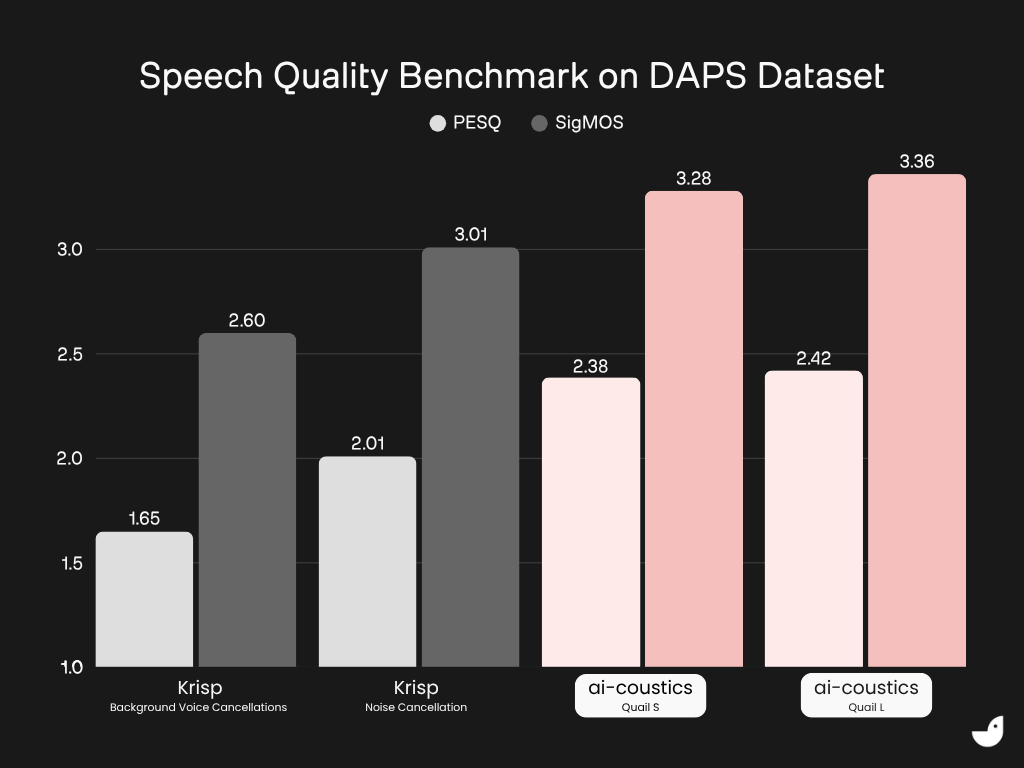 In summary, testing shows that ai-coustics consistently matches or surpasses Krisp across key audio quality benchmarks, excelling in low signal-to-noise and reverberant environments. Its Quail model produces clearer, more natural speech with minimal artifacts or distortion. With flexible integration and transparent performance data, ai-coustics sets a new benchmark for real-time audio enhancement.