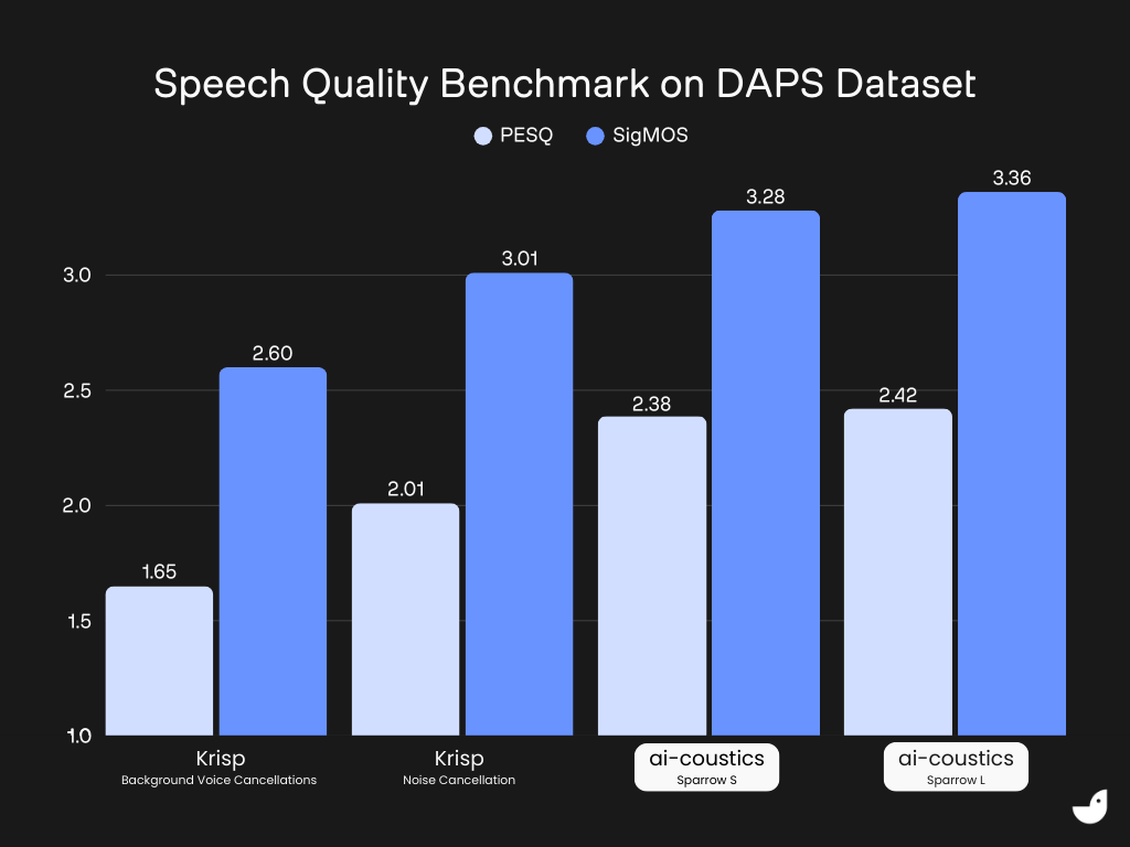 In summary, testing shows that ai-coustics consistently matches or surpasses Krisp across key audio quality benchmarks, excelling in low signal-to-noise and reverberant environments. Its Sparrow model produces clearer, more natural speech with minimal artifacts or distortion. With flexible integration and transparent performance data, ai-coustics sets a new benchmark for real-time audio enhancement.