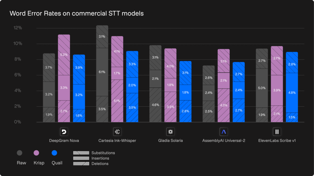 Instead of optimizing for perceptual audio quality, Quail preserves the machine-relevant phonetic structure that STT models rely on – delivering consistent improvements in WER compared to standard de-noising tools as highlighted below.