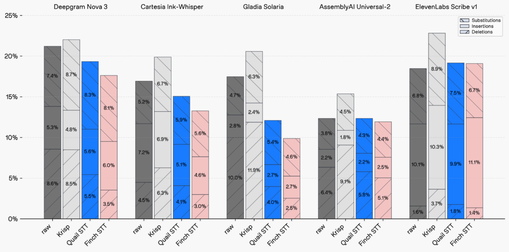 Before diving into provider-level performance, it’s important to understand three core components of Word Error Rate (WER). Each error type reveals why a model fails – not just how often. In the benchmarks below, the bars are split into three sections: