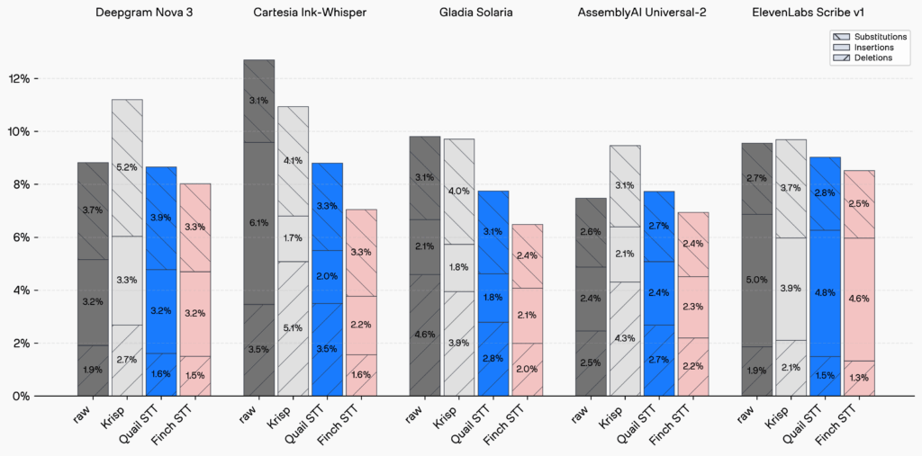 Quail STT provides some of the most dramatic improvements here: by restoring masked phonetic structure, deletions fall significantly and overall accuracy rises.