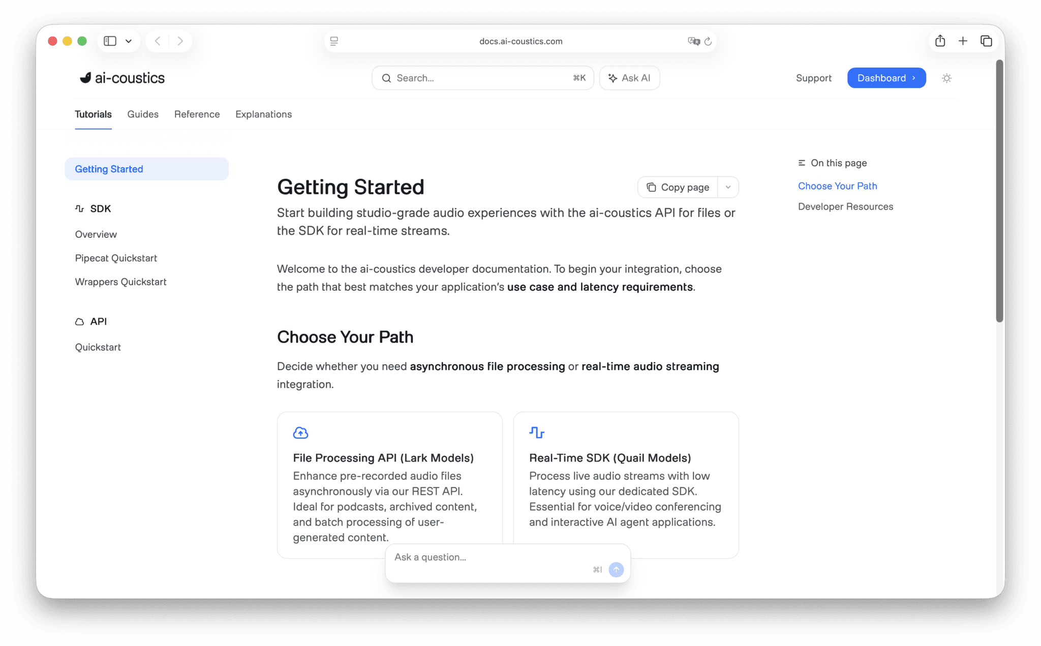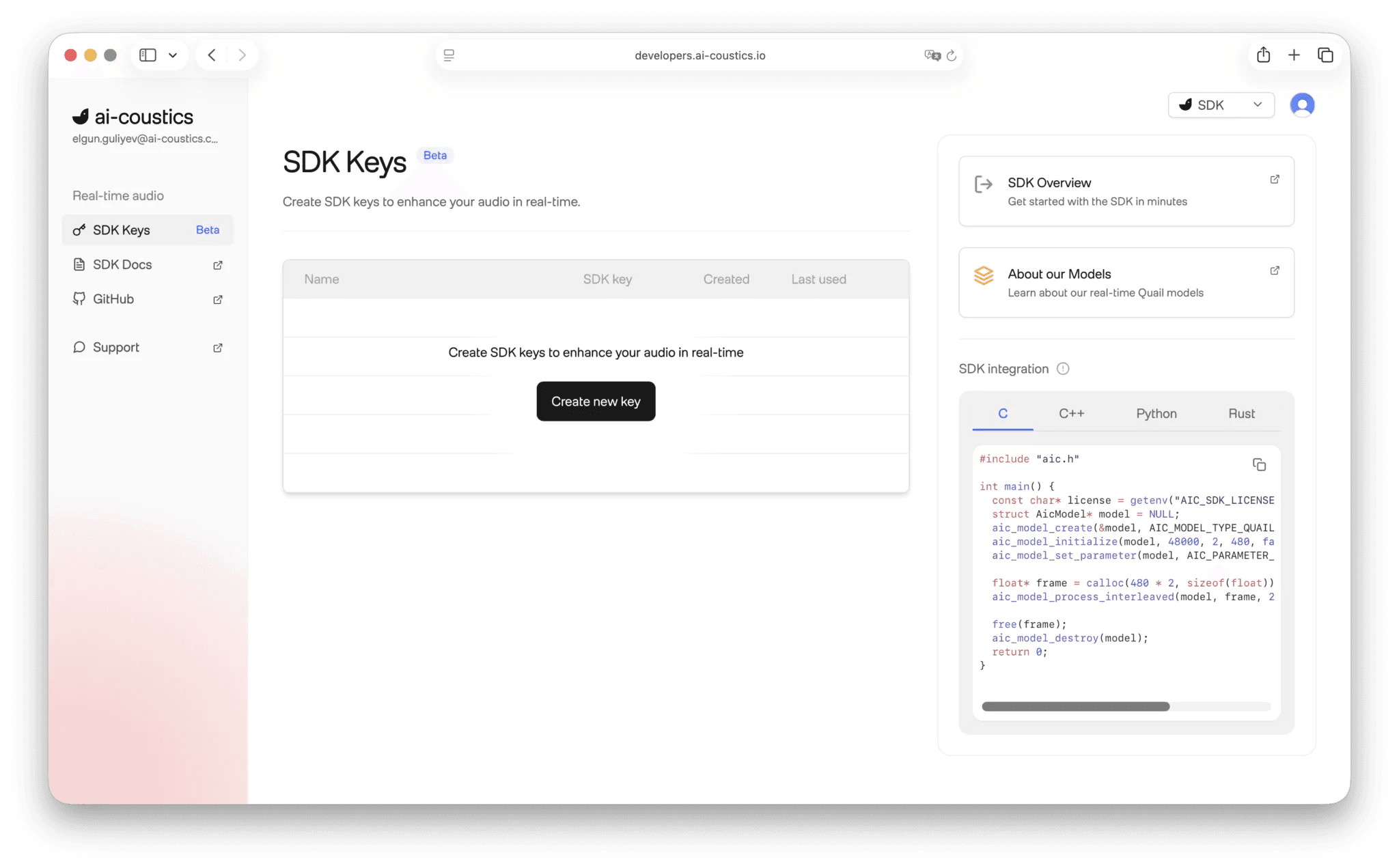 From the ai-coustics homepage, access the Developer Platform via the Sign Up/Login buttons. Either create a new account or sign into your existing account. Note that you’ll need a business email address.