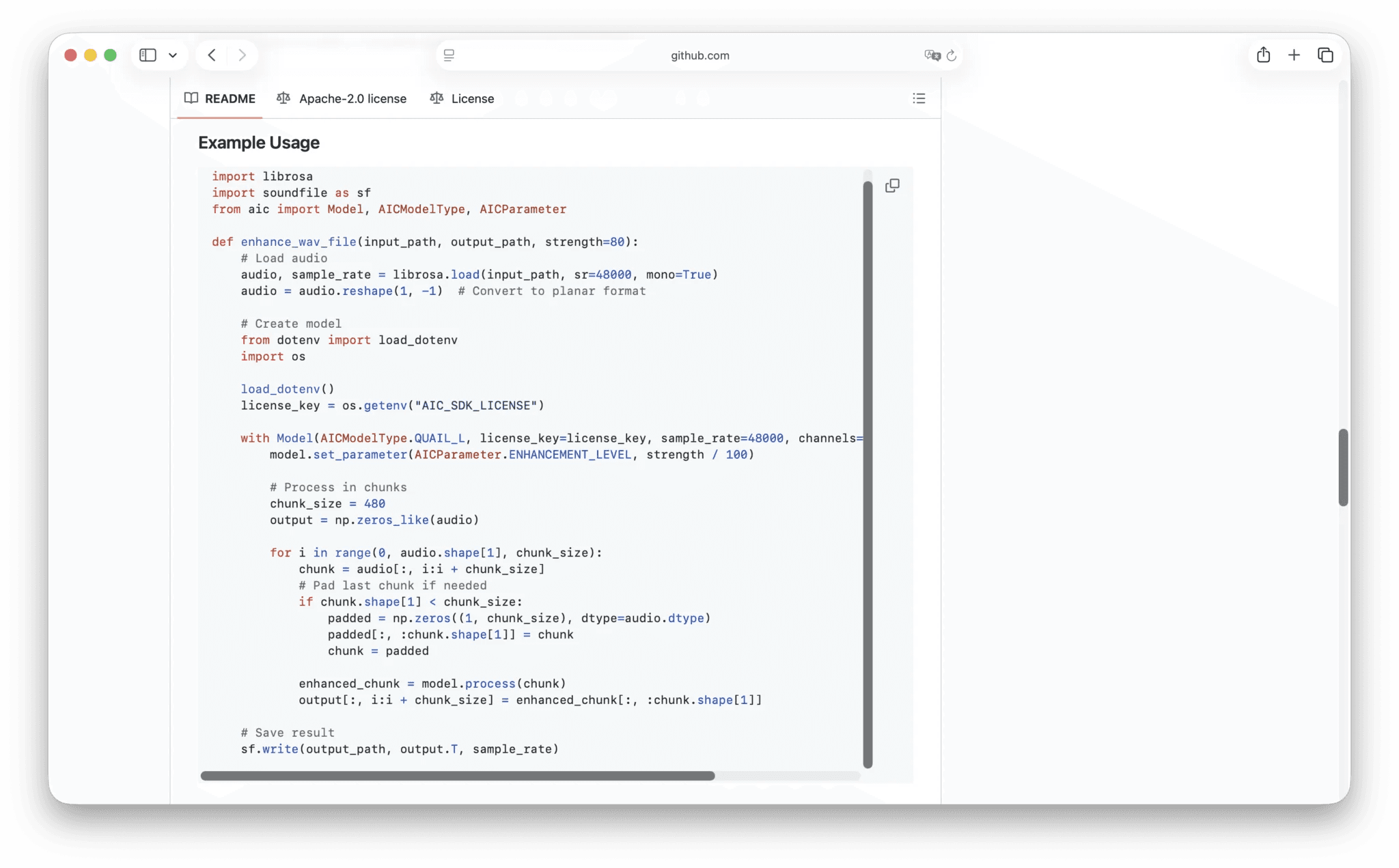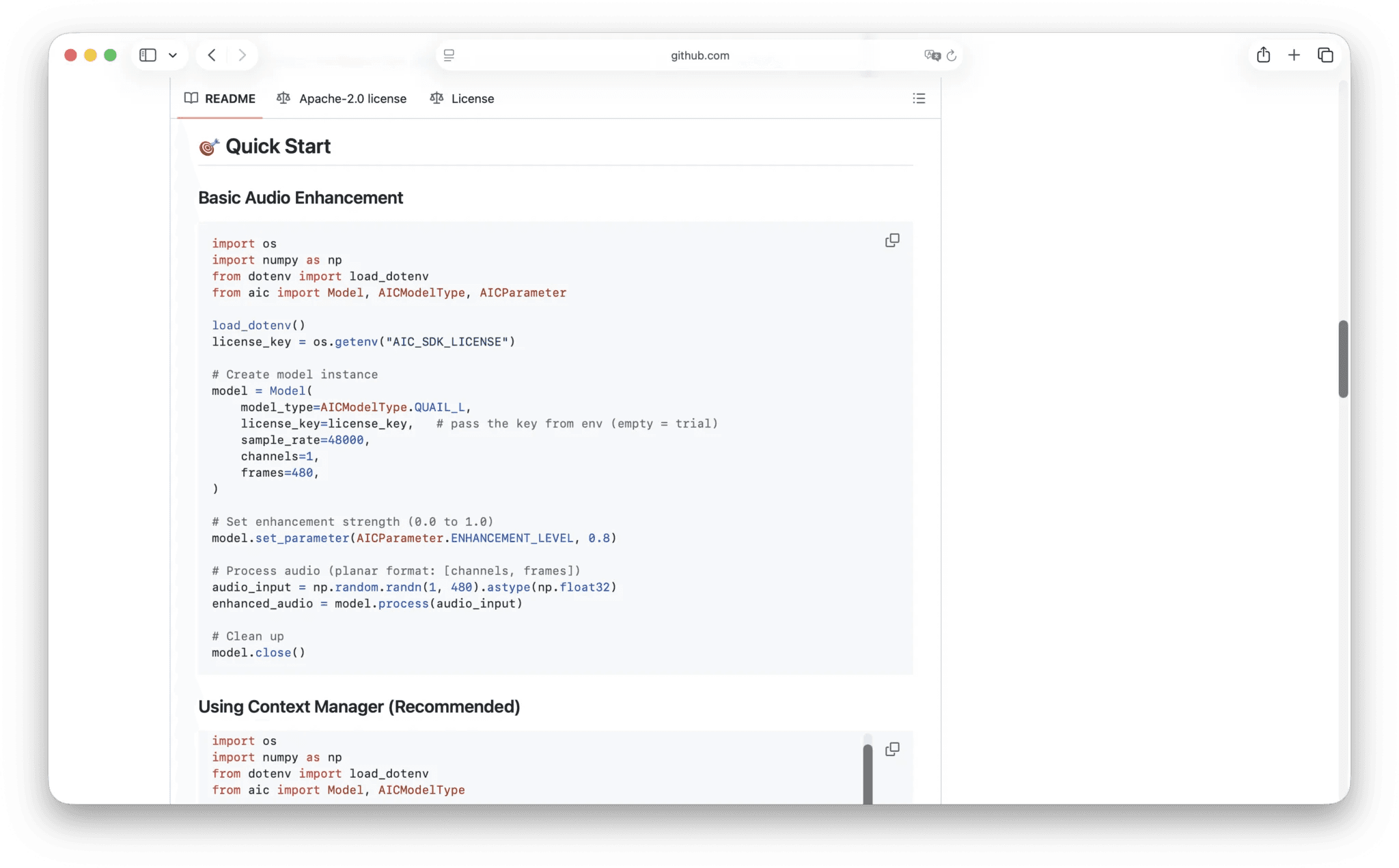 Let’s assume you’re using Python. Choose Python and scroll down to the “Quick Start” section, where you have access to a basic audio enhancement code. You can then copy this from the ReadMe and navigate to a Visual Studio Code project.