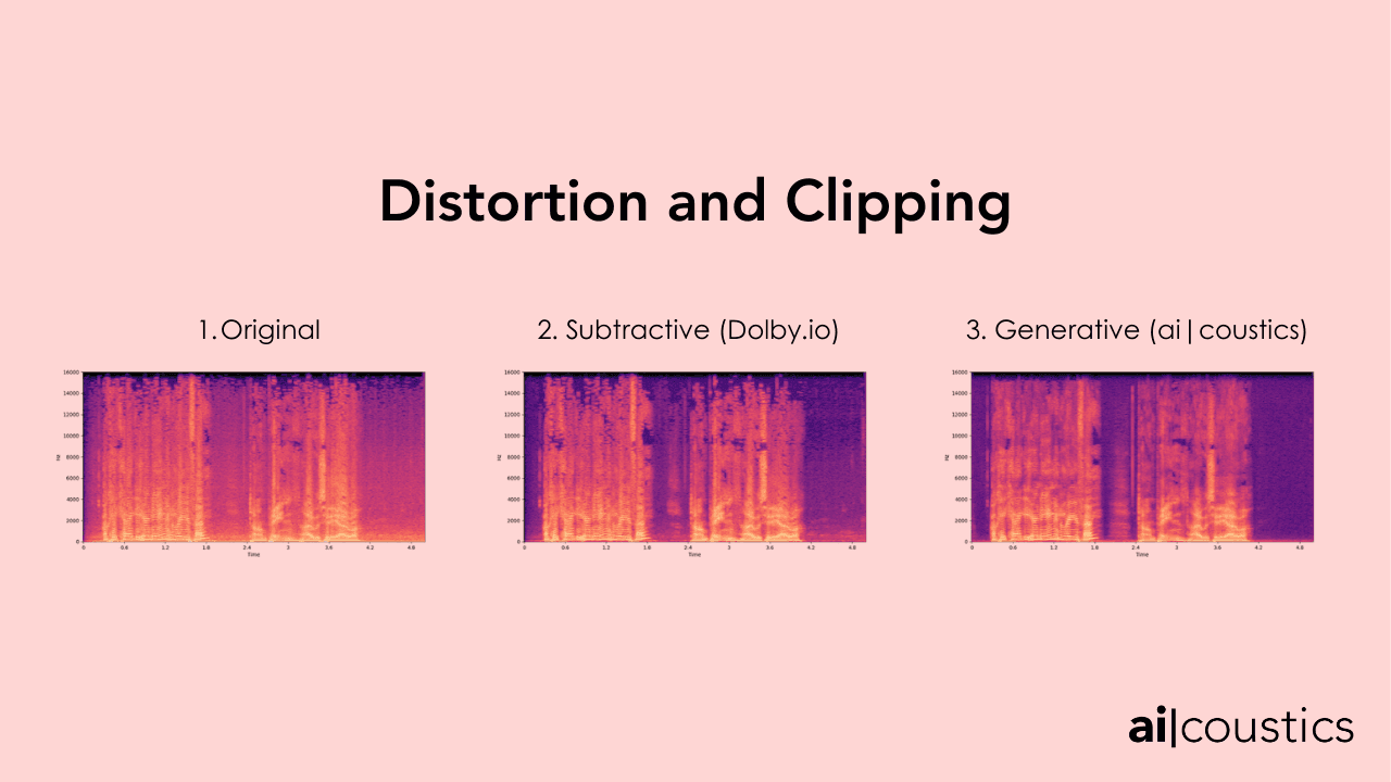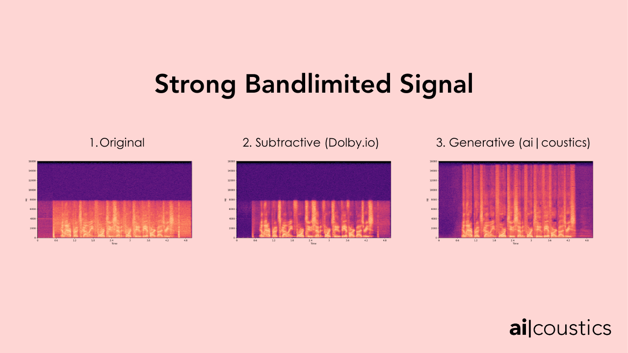 In an extreme bandlimited signal, the difference is even more pronounced and the spectrogram once again illustrates the difference between a subtractive and reconstructive approach. Dolby makes the audio clearer, but ai-coustics makes the audio seem as though it is coming from a high quality microphone, giving the speaker more resonance and returning the natural timbre to their voice.