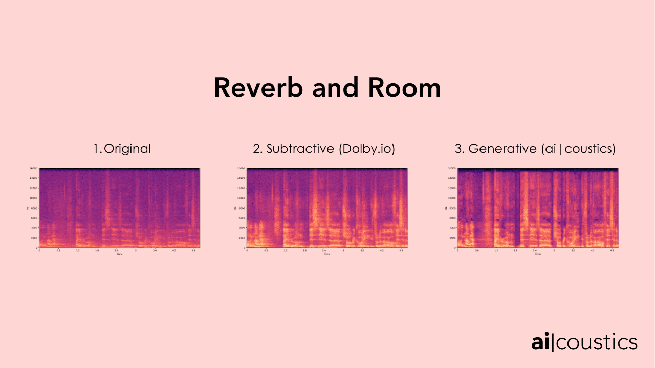 In this example, you can hear the difference between subtractive and reconstructive AI once again. While Dolby’s version removes the reverb signal between the speaker’s words, it still feels present within the actual speech; in the ai-coustics version, it sounds as though the speaker has moved closer to a high quality microphone.