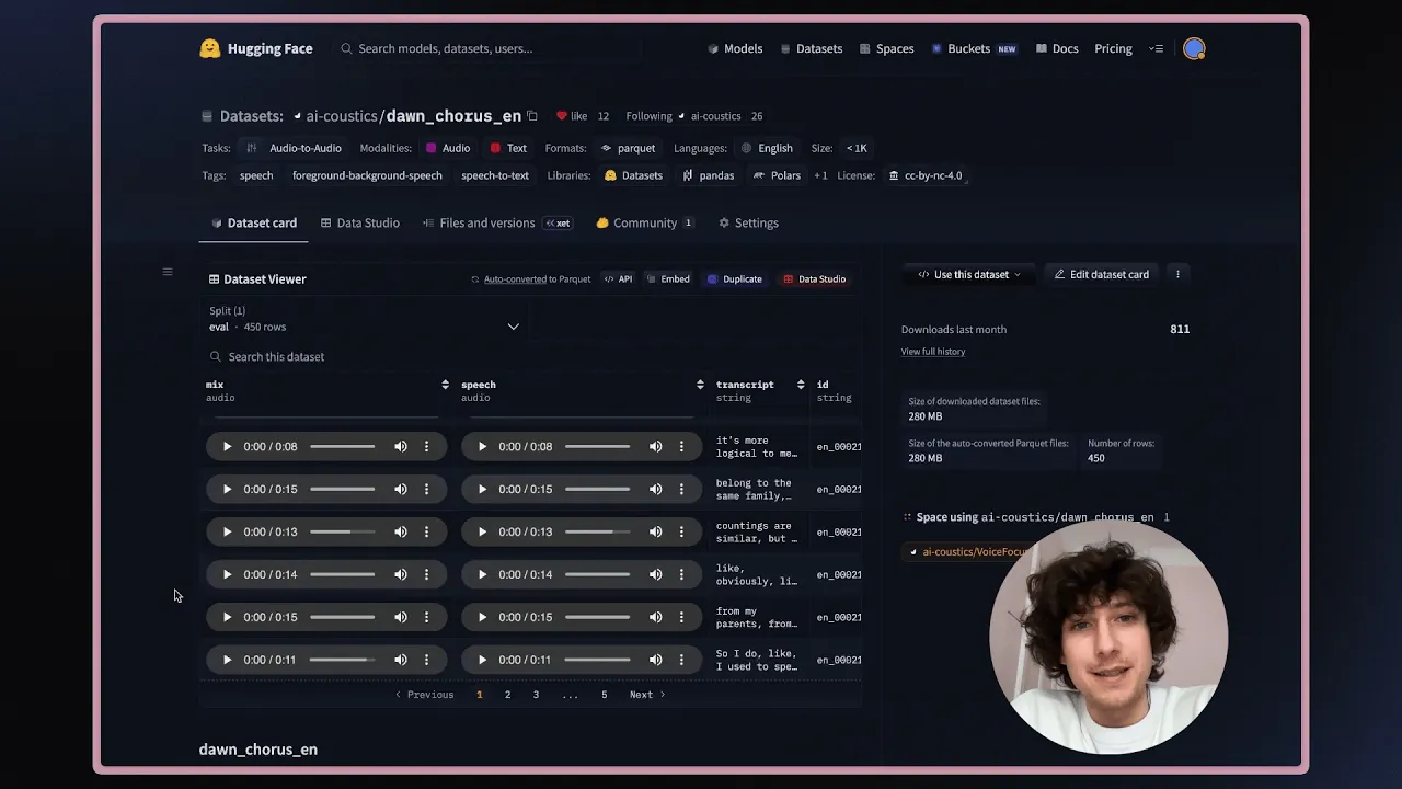 To analyze the effect of Quail VF 2.0 quantitatively, we will use the Dawn Chorus dataset we are open sourcing together with this release. Dawn Chorus is a data set we created specifically to evaluate foreground speaker isolation. It contains 450 challenging real-world recordings of foreground speakers and competing background speech as well as noise. For each example the clean foreground speaker audio as well as the transcript is available. Please visit the Hugging Face page for more information on how we created Dawn Chorus.